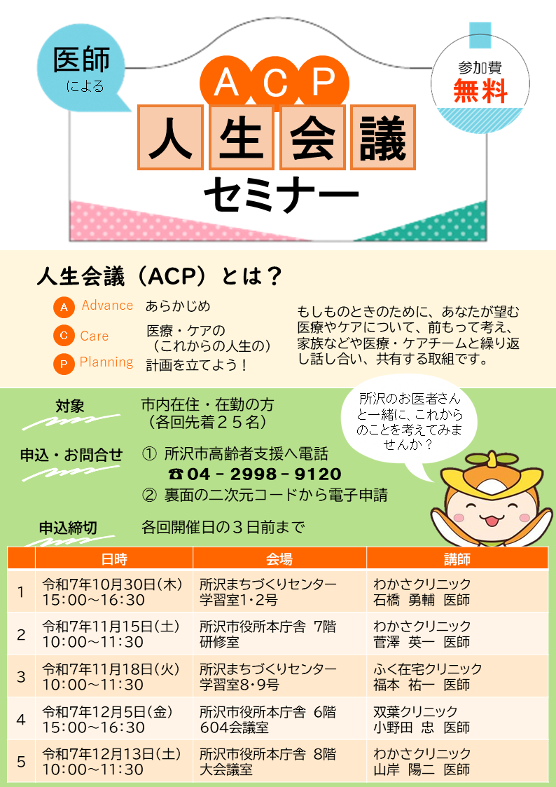 今回のセミナーでは、医師から、人生の最期まで自分らしく暮らし続けるための大切なプロセスである「人生会議(ACP:アドバンス・ケア・プランニング)について、お話しします。
