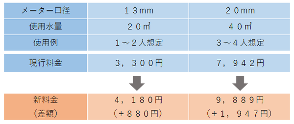 口径13ミリメートルで1月あたり10立方メートル使用した場合、現行の水道料金では安い方から7番目(令和6年4月1日時点)、現行の下水道使用料では安い方から7番目(令和5年4月1日時点)の金額となっています。